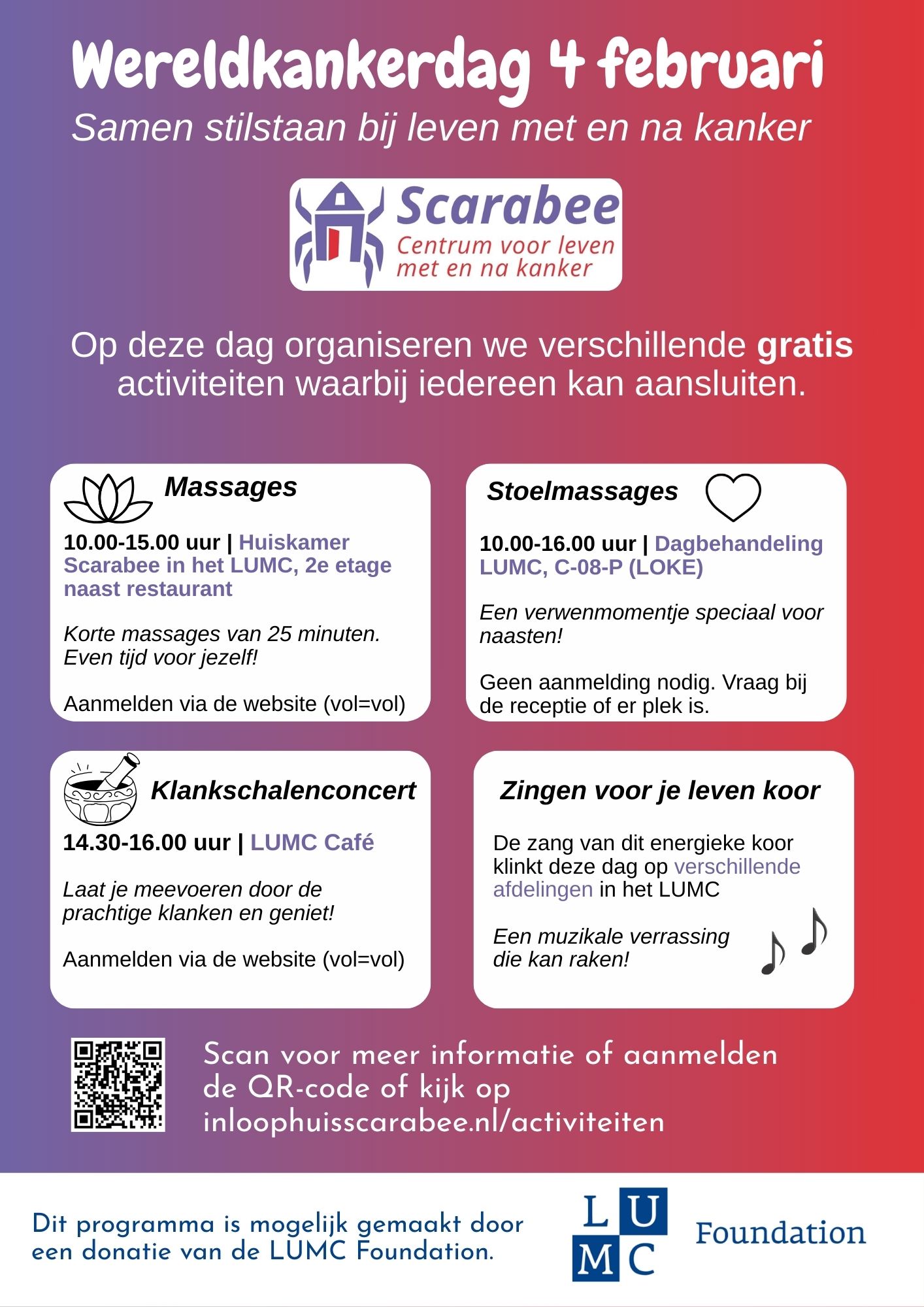 Op 4 februari organiseren wij verschillende gratis activiteiten in het LUMC. Verspreid door het ziekenhuis is er ruimte voor ontspanning, verstilling en ontmoeting, met onder andere korte massages, stoelmassages, een klankschalenconcert en muzikale momenten.